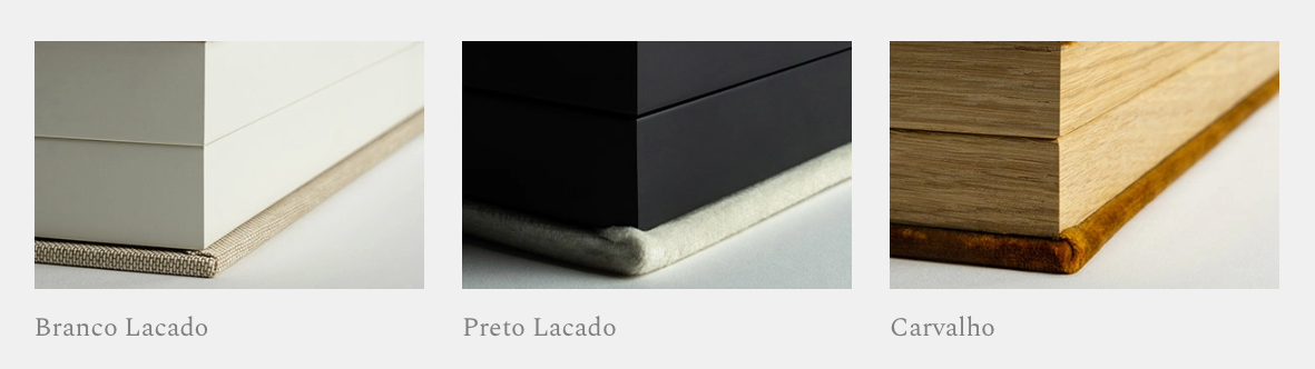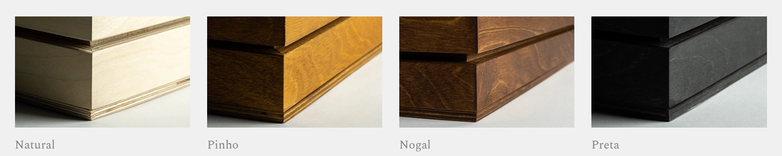Agora, vamos escolher a Box e o Aro para o álbum. Se já optou pela Box, basta escolher as opções de acabamento disponíveis. Caso ainda não tenha escolhido a Box, esta é a oportunidade de a adicionar e personalizar com as opções de Aro e acabamento. O Revestimento será igual ao que escolherem para álbum.