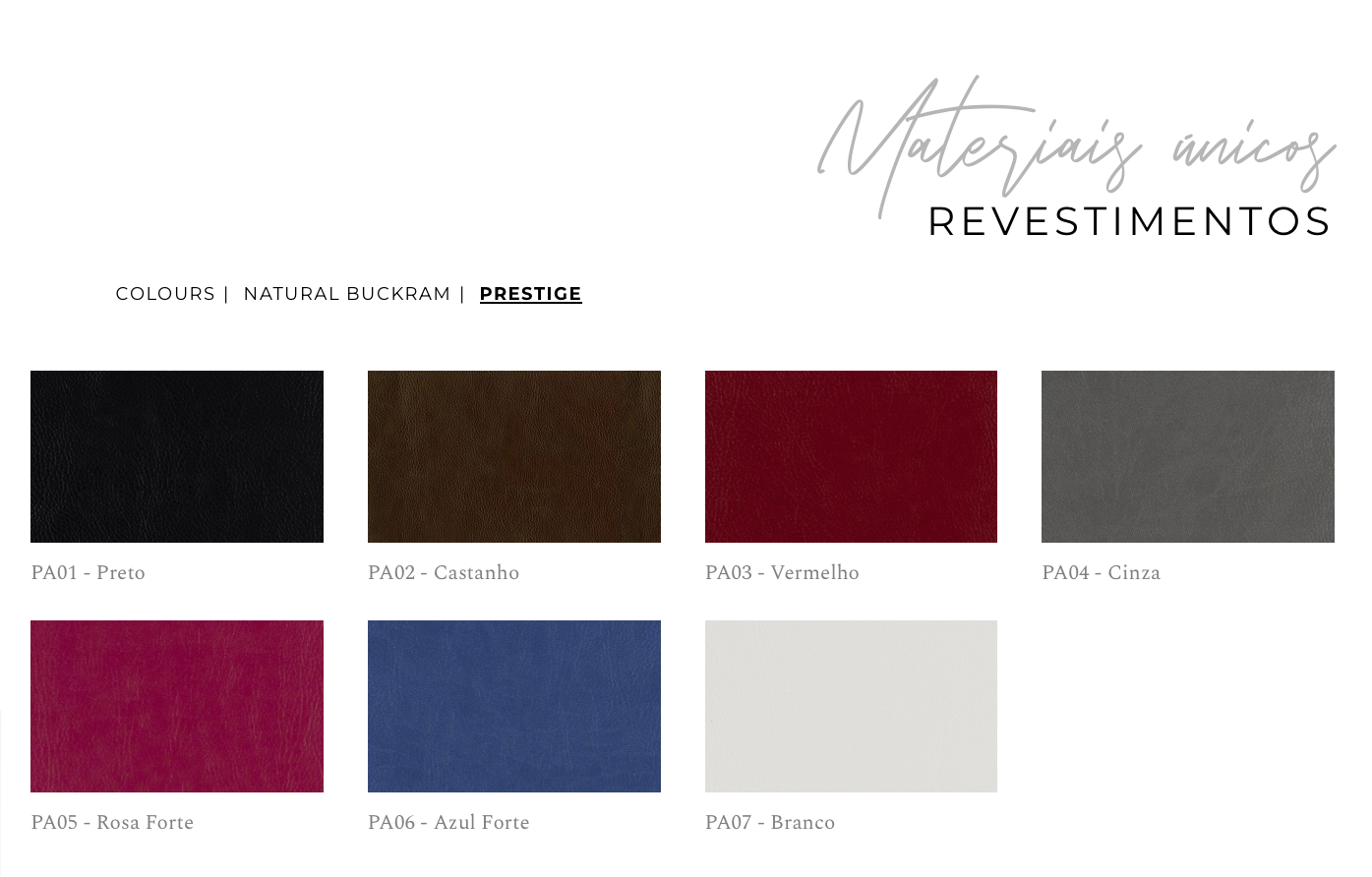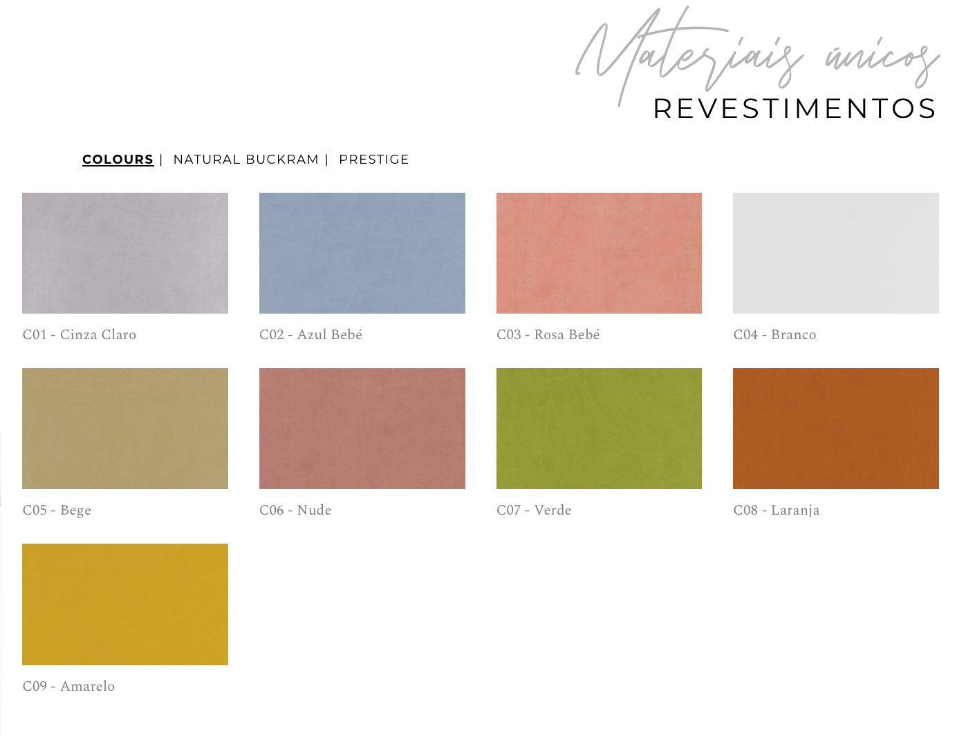 Desenvolvido através de materiais sintéticos delicados, o revestimento Colours é uma excelente alternativa à pele. Destaca-se pela sua estrutura resistente e macia ao toque. Oferece um grande leque de cores, desde tons pastel a cores mais vibrantes.