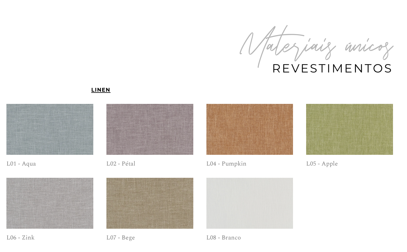 Formado por fibras naturais e orgânicas, o Linho é a opção mais sustentável entre todos os revestimentos, desde o seu plantio até à sua coloração. Revela cores neutras e delicadas, possui um toque macio, suave e com pequenos relevos. Devido à robustez do seu tecido, proporciona uma resistência inerente ao produto final. Perfeito para os clientes que valorizam produtos naturais
