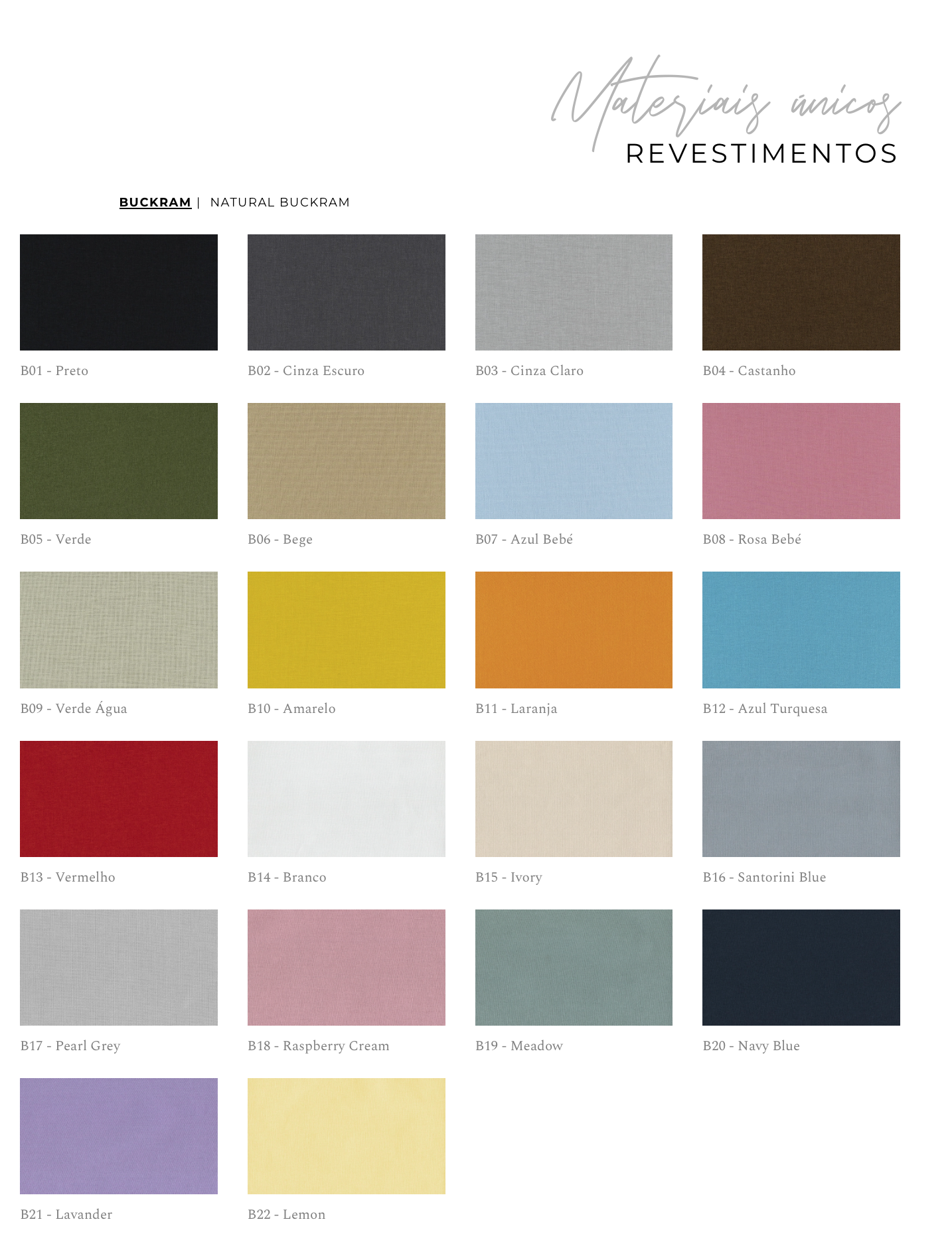 O revestimento em Buckram é composto por algodão rígido, dando origem a uma textura firme e resistente. Sendo conhecido pela durabilidade das suas fibras, o Buckram é um autêntico clássico que persiste de geração em geração. Possibilita a escolha de um vasto conjunto de cores, desde o seu tom natural até às cores mais vibrantes.