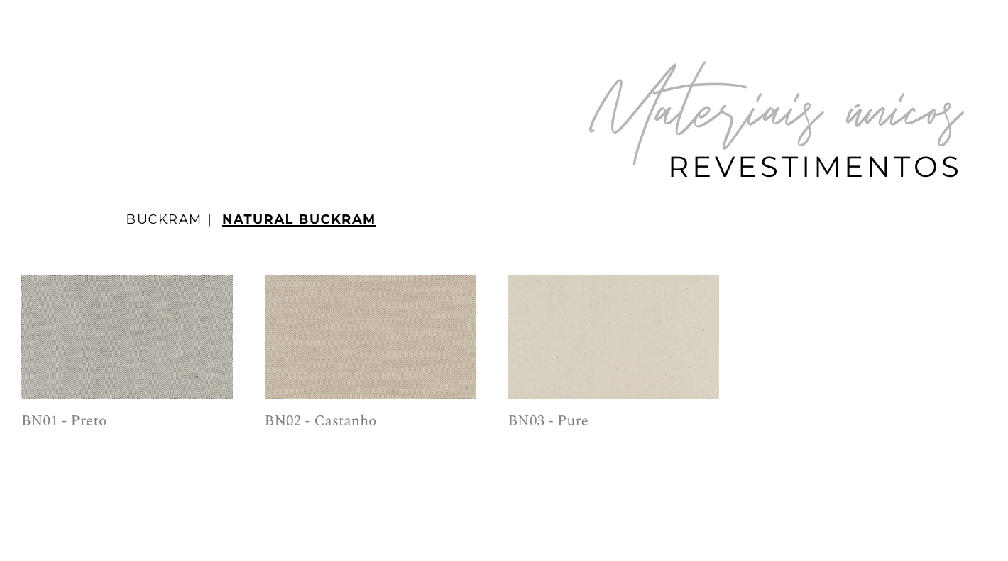 O Buckram Natural tem como característica principal o algodão natural entrelaçado com fios em diferentes tonalidades, entre fios escuros e mais claros. Oferece uma textura densa e resistente. O Buckram Natural traz uma particularidade mais artesanal ao seu produto sem deixar de lado a elegância.
